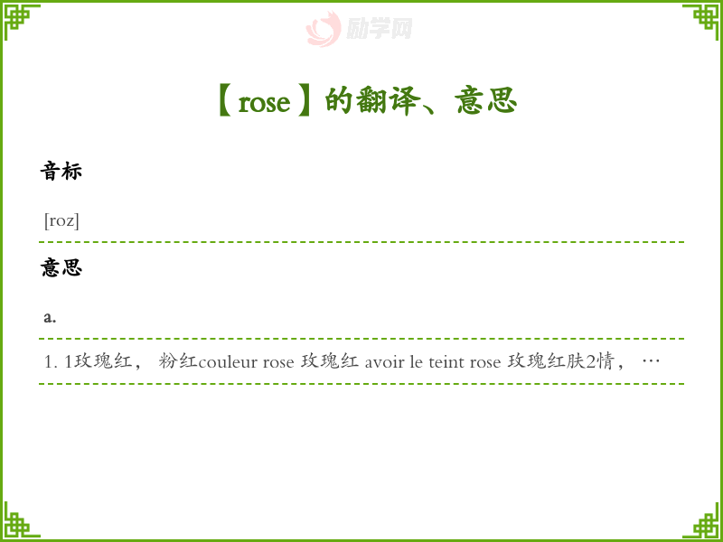 1. 1玫瑰红, 粉红couleur rose 玫瑰红 avoir le teint rose 玫瑰红肤2情, 桃3社[由社徽而得名]n. m玫瑰红, 粉红, 蔷薇aimer le rose 喜欢玫瑰红n. f.玫瑰花, 蔷薇花, 月季花;rose blanche 白玫瑰花 欢乐; être sur des roses 生活得愉快、舒适圆花饰, 圆花窗
