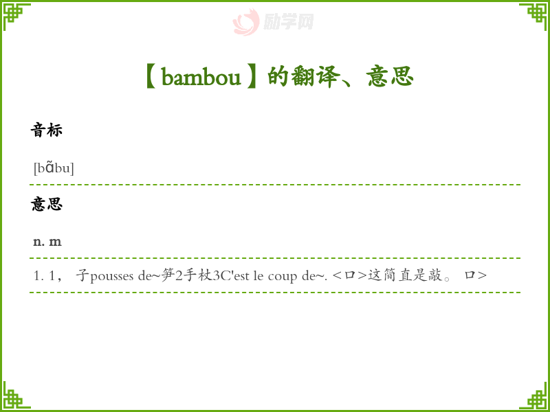 1. 1, 子pousses de~笋2手杖3C'est le coup de~. <口>这简直是敲。 口>