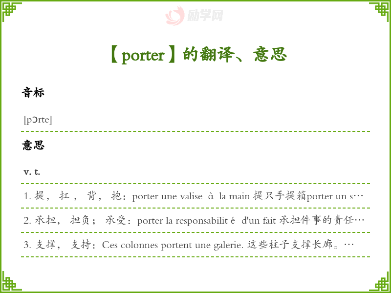 15. 给予, 带来:porter amitié à qn 对某人表示友好porter bonneur (malheur) 带来幸福[不幸]porter un coup à qn 打某人下; [转]给某人个打击[转]:porter plainte contre qn 告某人状porter témoignage de ce que l'on a vu 对所见的事作证porter envie à qn 羡慕某人, 嫉妒某人porter secours à qn 帮助某人porter un jugement sur qn (sur qch) 对某人[对某物]发表意见porter la parole 代人说话, 以他人名义发言1