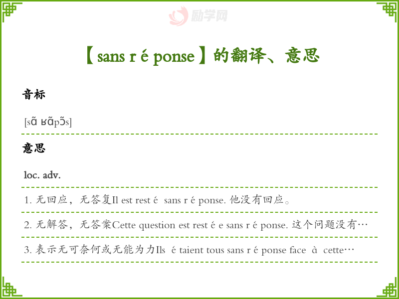 1. 无回应,无答复Il est resté sans réponse. 他没有回应。