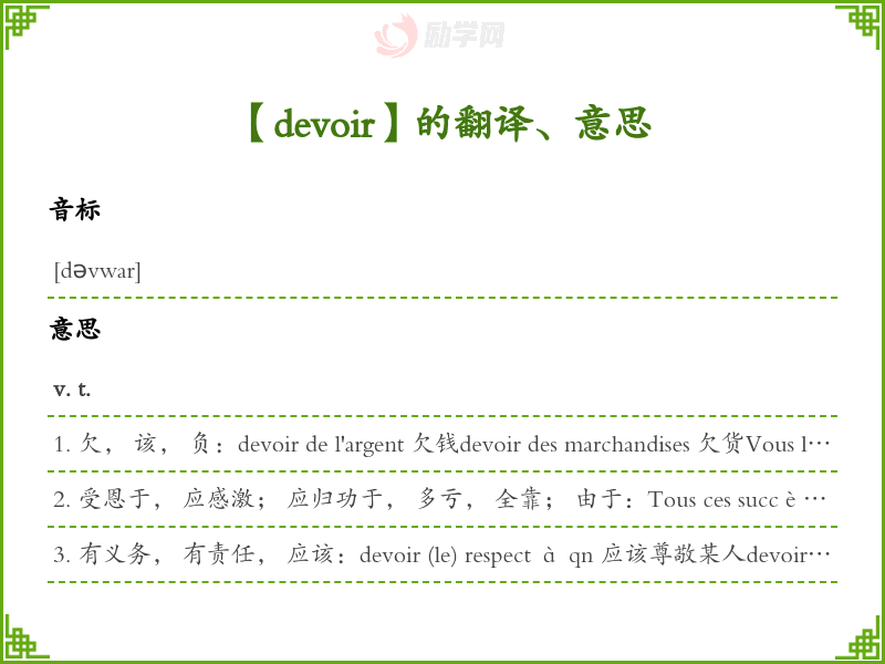 3. 有义务, 有责任, 应该:devoir (le) respect à qn 应该尊敬某人devoir obéissance aux lois 应该遵守法律avec les honneurs qui lui sont dus 以合乎身份的礼遇Je lui dois bien cela. 应该这样待他。 devoir (+inf. )(1) 应当, 必须, 不得不:Vous auriez dû me prévenir. 你本来应该事先通。 Enfin j'ai dû consentir. 后只好同意了。 Cela devait arriver! 这是必然发生的!早就料到发生这件事!Il ne devait plus les revoir. 他在这以后就再见不到他了。 (2)[引]打算, 意欲:Je dois partir demain. 打算明天动身。 Nous devions l'emmener avec nous mais il est tombé malade. 们本来想带他一块儿走, 可是他了。 (3)大概, 可能, 想必:Il doit être grand maintenant. 他现在一定长得很大了。 Vous devez vous tromper. 你可能搞错了。 C'est lui qui a dû faire cette sottise. 这桩蠢事想必是他干的。 Il a dû partir ce main. Il doit être parti ce matin. 他大概今天早上走了。 (4)[书]即使, 哪怕[用虚拟式未完成过去时]:Dusse-je être blâmé, je vous soutiendrai. 即使受到责备, 持你。 Dussent mille dangers me menacer, … 纵使有千千万万的危险威胁, …(5)将, [用不定式或现在分词]:Il pense devoir finir ce travail bientôt. 他想不久就会完成这工作。 Dois partir demain, je viens vous trouver aujourd'hui. 明天动身, 所以今天来找你。se devoir v. pr.