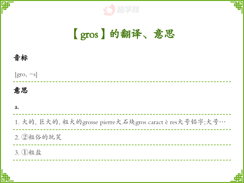 12. 粗俗的, 粗鄙的gros mots粗字眼, 脏话, 骂人话grosse plaisanterie粗俗的玩笑une grosse bête, un gros lourdaud〈口语〉傻大个, 大傻瓜~ses vérités众所周知的道理un gros bon sens〈口语〉普通的常识, 朴实的道理C'est gros, un peu gros .这有点过分。这有点不像话。