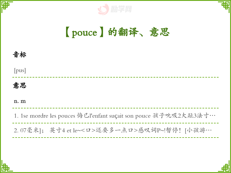 1. 1se mordre les pouces 悔已l'enfant suçait son pouce 孩子吮吸2大趾3法寸[法国古长度单位, 等于 1/12法尺, 约合2