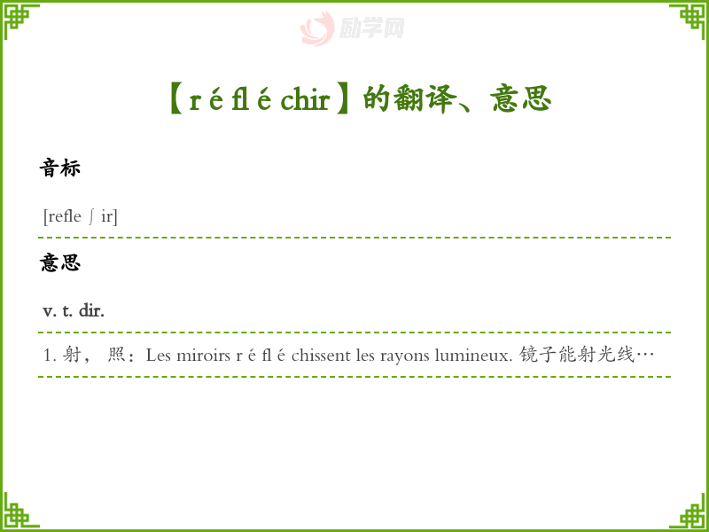 1. 射, 照:Les miroirs réfléchissent les rayons lumineux. 镜子能射光线。v. t. indir.索, , 虑:réfléchir sur une question 一个题réfléchir sur soi-même 虑自己的、动réfléchissez à ce que vous avez fait! 想想你干的事吧!réfléchir que 虑到:En acceptant votre invitation, je n'ai pas réfléchi que je ne pourrai m'y rendre. 接受你的邀请时, 我没有虑到我不能来。v. i.索, , 虑:chose qui donne à réfléchir 值得深的事Laissez-moi le temps de réfléchir. 给我时间虑一下。 Je demande à réfléchir. 我要求允许我虑一下。se réfléchir v. pr.(被)射; 映照:arbres qui se réfléchissent dans un lac 映照在湖中的树影