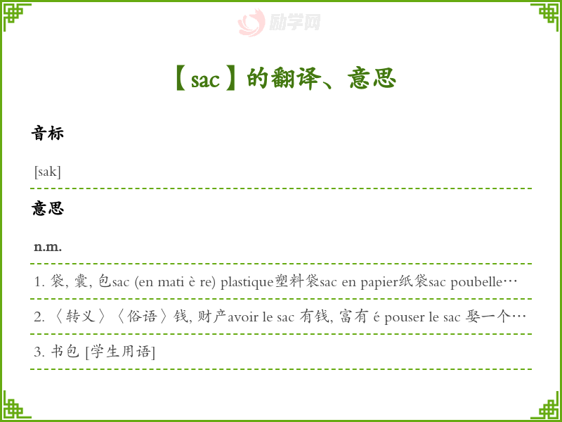 1. 袋, 囊, 包sac (en matière) plastique塑料袋sac en papier纸袋sac poubelle垃圾袋sac à farine面粉袋sac de sable(供拳击手练拳用的)沙袋course en sac 套袋赛跑mettre en sac 装袋sac de voyage, 〈旧语,旧义〉 sac de nuit 旅行袋sac de couchage睡袋sac à ouvrage针线活计袋sac à dos背包Sac au dos!背上背包!sac (à main)女用手提包sac à malices魔术袋Sac à papier!〈旧语,旧义〉见鬼!être fagoté [ficelé] comme un sac 衣衫褴褛[用作appos.]paletot sac 宽腰身大衣robe sac 直统裙sac d'embrouilles, sac de nœuds〈语〉麻一团mettre dans le même sac 不分好歹, 混为一谈prendre qn la main dans le sac 将某人当场捉住L'affaire est dans le sac .事情已有十分把握。avoir plus d'un tour dans son sac 诡计多端sac à vin酒鬼, 醉汉homme [gens] de sac et de corde〈转义〉十恶不赦的坏人