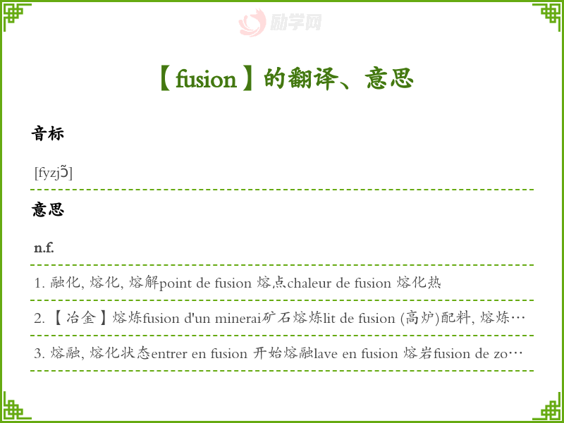 7. 〈转义〉融合, 合, 联合fusion de deux sociétés两个公司合fusion entre l'homme et la nature人与自然融合fusion de deux fichiers【计算机】两个文件合