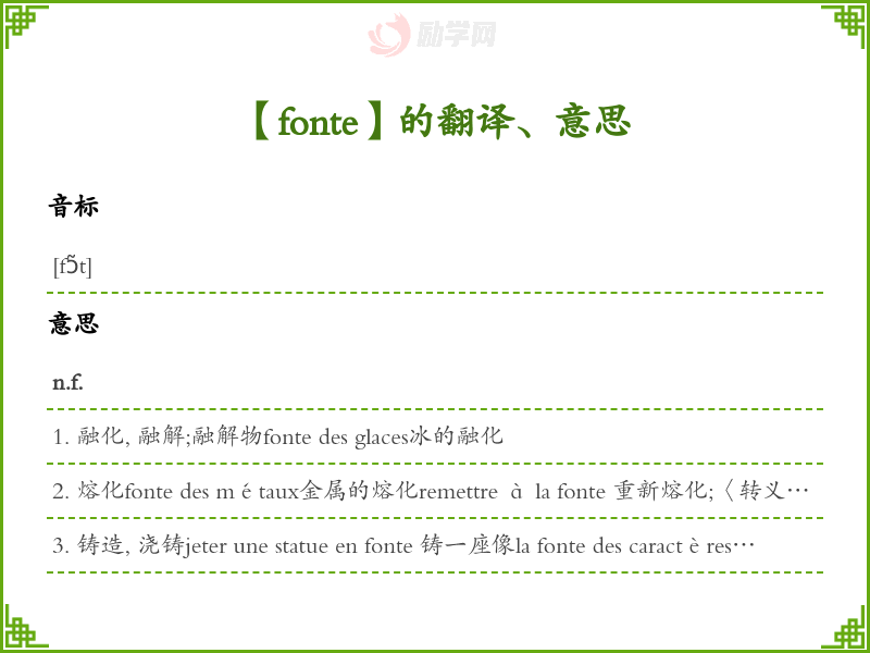 2. 熔化fonte des métaux金属的熔化remettre à la fonte 重新熔化;〈转义〉重新做