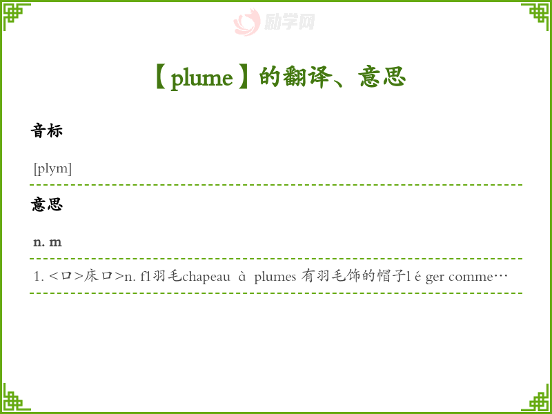 1. <口>床口>n. f1羽毛chapeau à plumes 有羽毛饰的帽子léger comme une plume 如羽毛,2(旧时的)羽笔; 钢笔尖plume d'oie 鹅毛笔plume métalique 钢笔尖 3笔, 笔杆子; <转><书>写作, 作家; 文笔4鱿鱼骨片5 ~à vaccin(疫苗)接种针书>转>