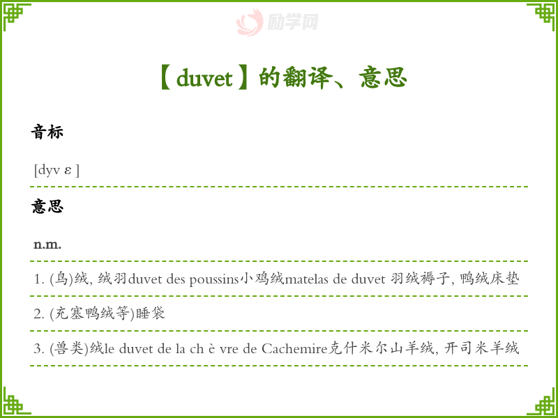 1. (鸟)绒, 绒羽duvet des poussins小鸡绒matelas de duvet 羽绒褥子, 鸭绒床垫