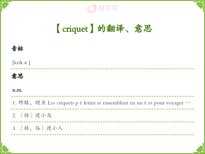 1. 蚱蜢,蝗虫 Les criquets pèlerins se rassemblent en nuées pour voyager et dévorent la végétation sur leur passage.飞蝗集中成云雾状迁移,所经之地寸草不留。lutte contre les criquets防蝗斗争stridulation du criquet蝗虫飞行时吱吱声