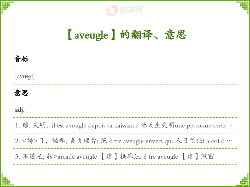【aveugle】 词源: 形容词变化: 名词变化: 副词变化: 近义词: 反义词: 联想词