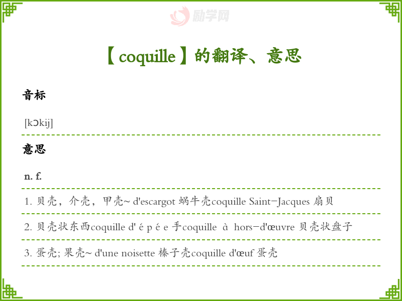 1. 贝壳,介壳,甲壳~ d'escargot 蜗牛壳coquille Saint-Jacques 扇贝
