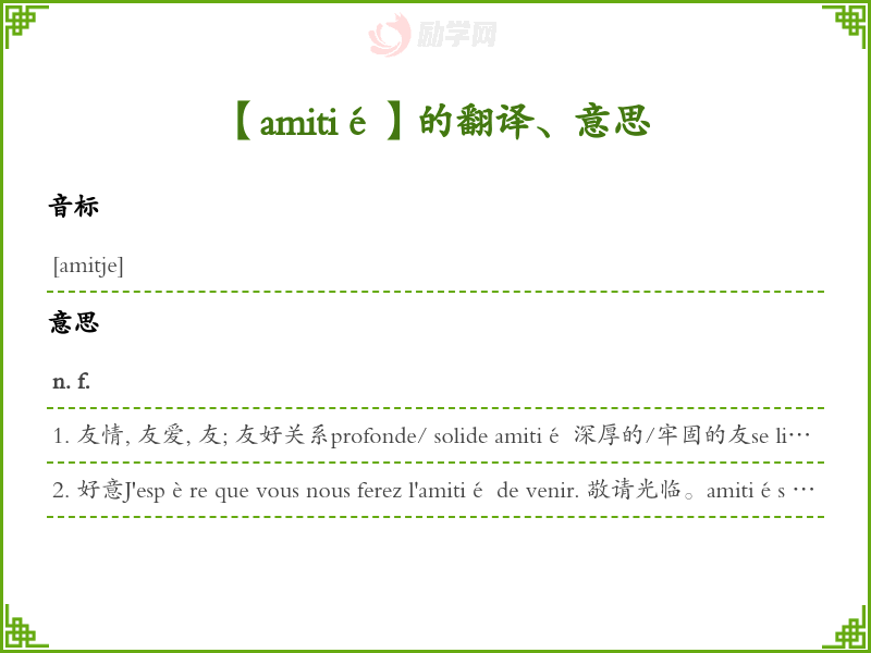 1. 友情, 友爱, 友; 友好关系profonde/ solide amitié 深厚的/牢固的友se lier d'amitié avec qn. 与某人结交prendre qn. en amitié 友好地对待某人amitié particulière (青少年的)同性恋