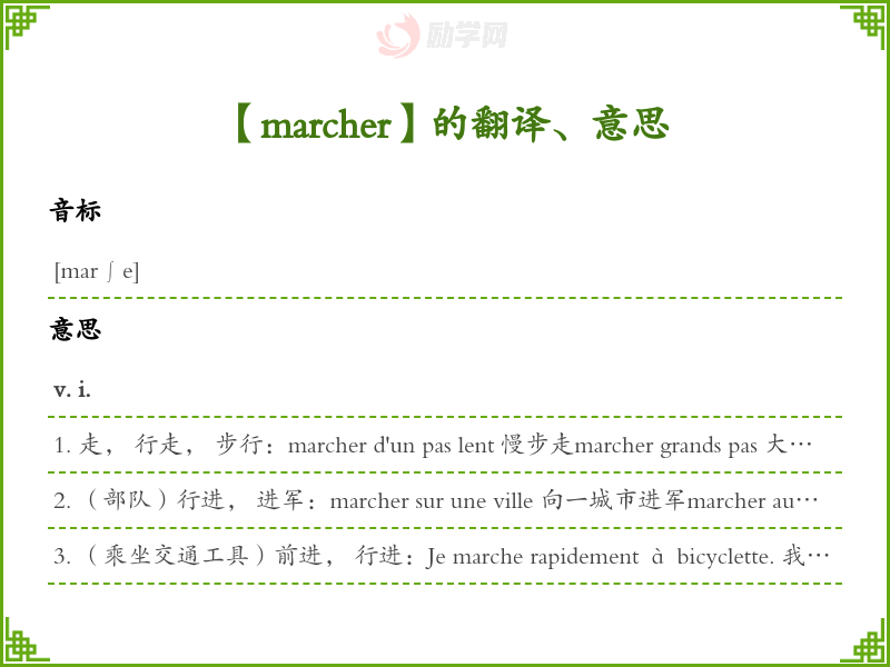 1. 走, 行走, 步行:marcher d'un pas lent 慢步走marcher grands pas 大踏步走marcher à pas de loup 蹑手蹑脚地走marcher à quatre pattes 爬行marcher à reculons 倒退marcher sur la pointe des pieds 踮起脚走marcher sur qn 气势汹汹地走向某人marcher vers la ville 步行进城去marcher à pas de géant de victoire en victoire [转]迈着巨人般的步伐从胜利走向胜利marcher avec qn la main dans la main, marcher avec qn comme un seul homme[转]与某人步调一致与某人见一致marcher droit [转]品行端正, 规规矩矩