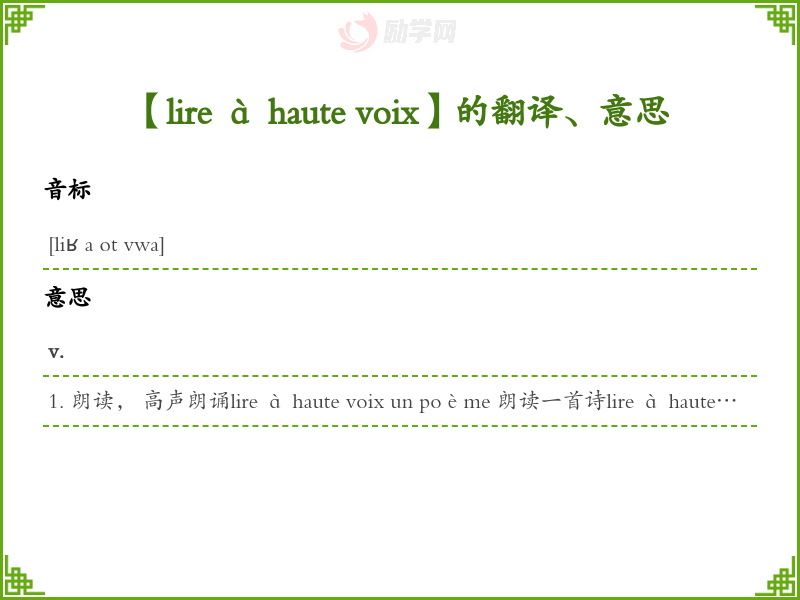 1. 朗读, 高声朗诵lire à haute voix un poème 朗读一首诗lire à haute voix un livre 朗读一本书