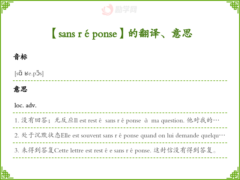 1. 没有回答;无反应Il est resté sans réponse à ma question. 他对我的问题没有回答。
