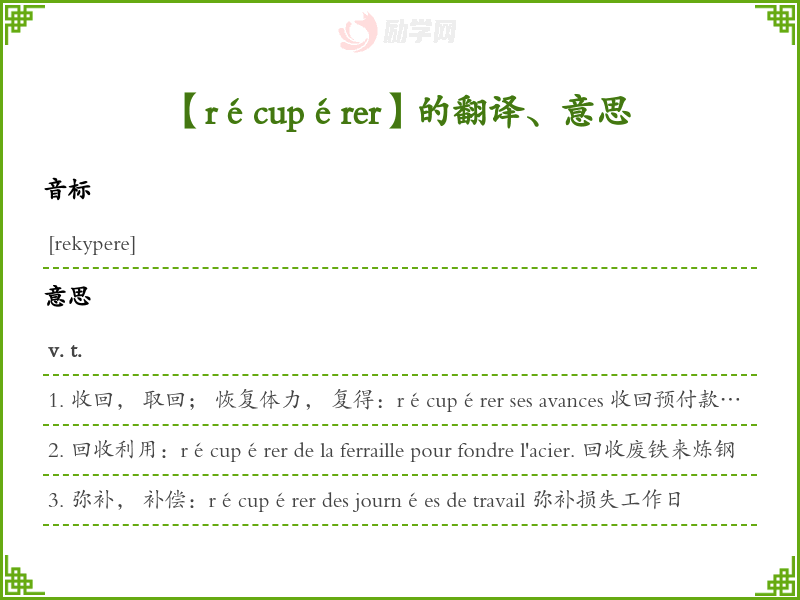 1. 收回, 取回; 恢复体力, 复得:récupérer ses avances 收回预付款récupérer les livres qu'on a prêtés 把借出去书收回来récupérer (ses forces) 恢复体力:Certains athlètes récupèrent très vite. 能很快恢复体力。