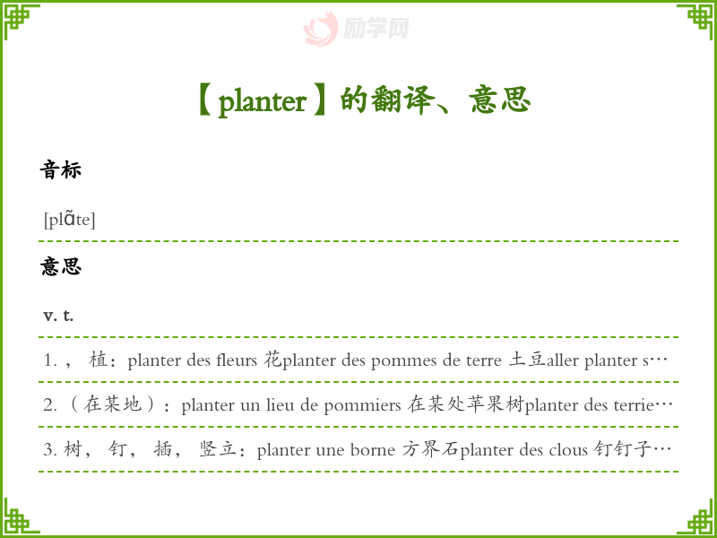 1. , 植:planter des fleurs 花planter des pommes de terre 土豆aller planter ses choux [俗]菜去[喻退隐乡下或去干简单的事]