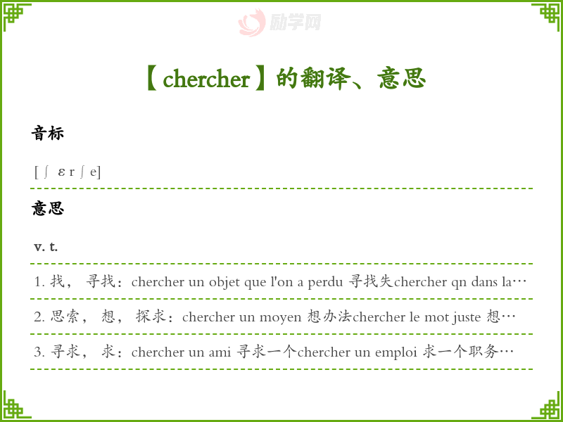 1. 找, 寻找:chercher un objet que l'on a perdu 寻找失chercher qn dans la foule 在人群中找人Je vous cherchais. 我正在找你。 chercher l'ennemi 找敌人打chercher une aiguille dans une botte de foin [转]大海捞针chercher la petite bête [转]吹毛求疵chercher des poux dans la tête de qn [转]找人的碴儿