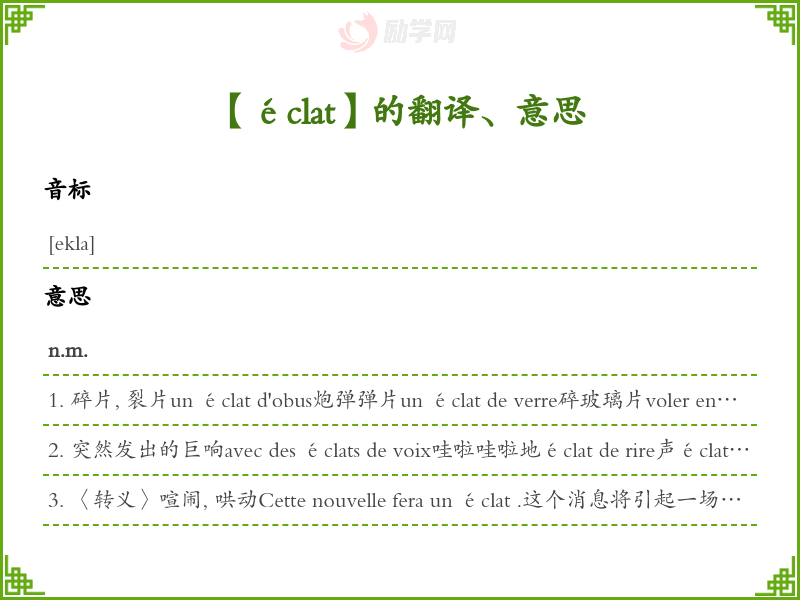 【éclat】 联想: 名词变化: 形容词变化: 近义词: 反义词: 联想词