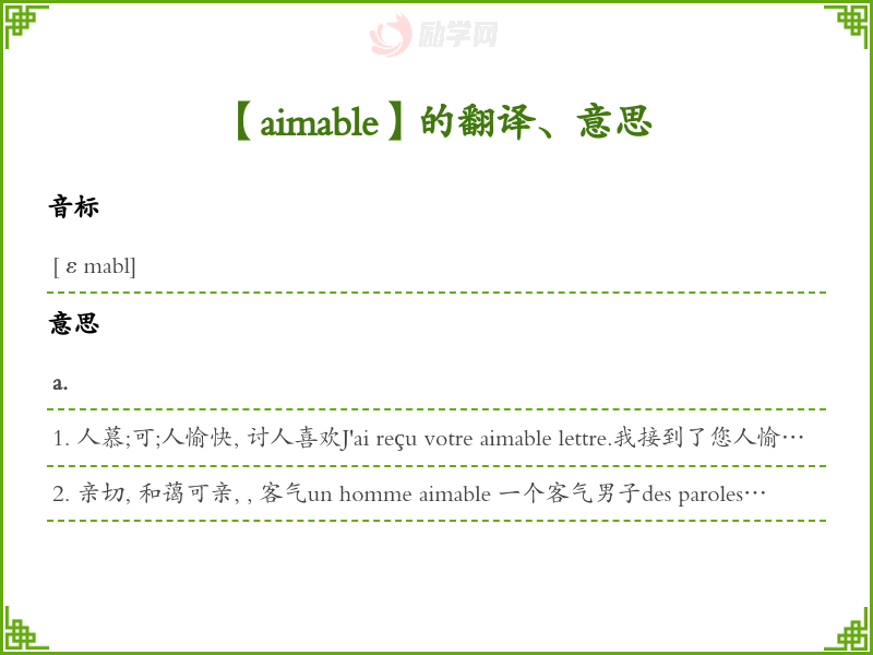 1. 人慕;可;人愉快, 讨人喜欢J'ai reçu votre aimable lettre.我接到了您人愉快来信。