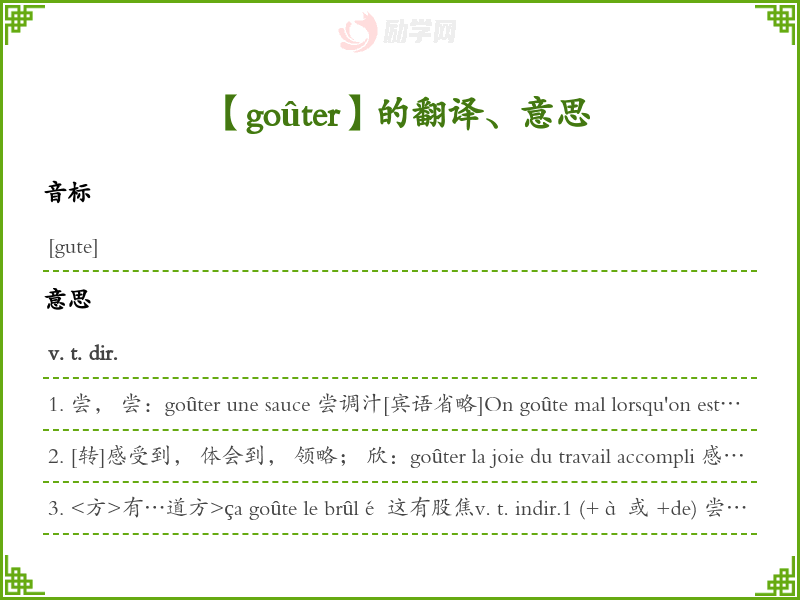 1. 1 (+à 或 +de) 尝, 尝, 略吃一点:Goûtez à ces gâteaux 请尝一尝这些糕点。 goûter de qch [转]尝尝某事道2 (+de)试试[指第一次尝]3<方>食道为…所喜欢方>v. i.(下午)吃点心:donner à goûter aux enfants 给孩子们吃点心se goûter v. pr.被尝; <转>被欣转>n. m下午点心[指儿童在下午食用食及饮料, 相对于成人用下午茶(thé)]