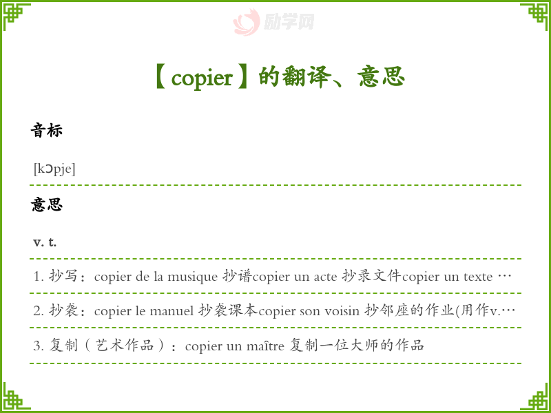 2. 抄袭:copier le manuel 抄袭课本copier son voisin 抄邻座的作业(用作v. i. ) copier sur son voisin 抄邻座的作业Il copie. 他抄别人的作业