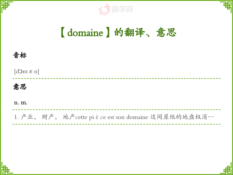 1. 产业, 财产, 地产cette pièce est son domaine 这间屋他的地盘权消失, 权期满[转]领域, 范围, 范畴范围以内l'histoire de la Seconde Guerre mondiale est son domaine 第二次世界大战史他的专长[数]区, 域, 区域专业, 专长酒候, 勃艮第地区对于种植葡萄葡萄酒产业的特称