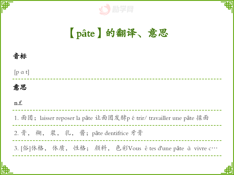 【pâte】 派生: 联想 名词变化: 近义词 同音、近音词 联想词