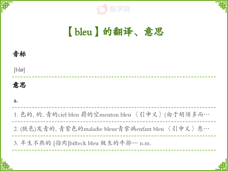 1. 色的, 的, 青的ciel bleu 蔚的空menton bleu 〈引申义〉(由于胡须多而硬)剃得发青的下巴颏conte bleu 〈转义〉〈旧语,旧义〉海外奇谈, 瞎扯的故事cordon bleu 〈转义〉高明的女厨师sang bleu 〈转义〉贵族出身le métal bleu 钴zone bleue色地区 [指法国大城市停车不得超过一小时的地区]