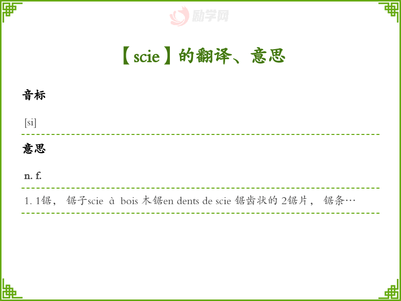 1. 1锯, 锯子scie à bois 木锯en dents de scie 锯齿状的 2锯片, 锯条3(poisson)~[动]锯鳐4 ~ musicale [乐]锯琴5老调, 陈词滥调, 老一套; 6[俗]的, 的事物