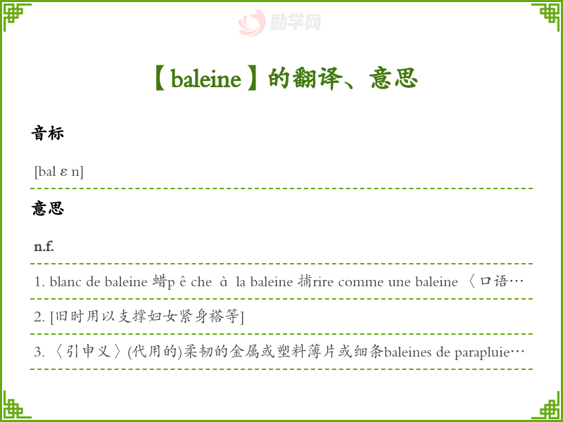 1. blanc de baleine 蜡pêche à la baleine 捕rire comme une baleine 〈口语〉张口大