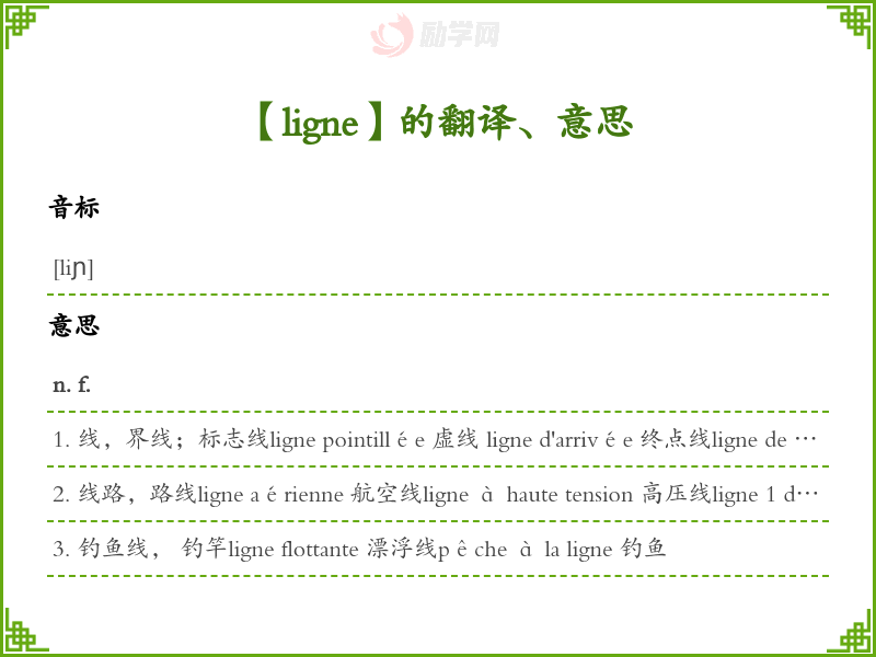 7. , , , 字des arbres plantés en ligne 成排种植的树hors ligne <转>出类拔萃的mettre en première <转>放在首位mettre sur la même ligne <转>置于同水平上转>转>转>