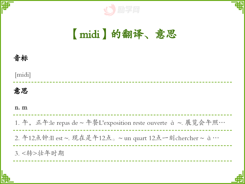 5. le M~ 南方;南欧;法国南方:descendre dans le M~ 到南部去转>a. inv乐器数字(化)口[为英文musical instrument digital interface的缩写]
