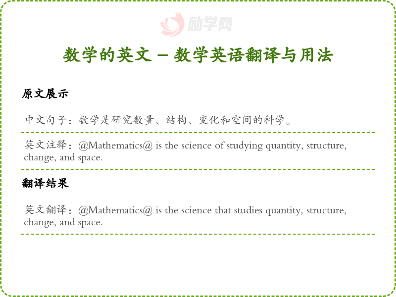 数学是研究数量、结构、变化和空间的科学。 - @Mathematics@ is the science that studies quantity, structure, change, and space.