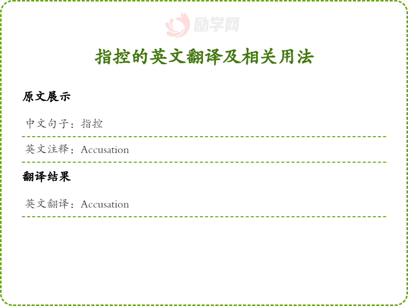 翻译思路:在翻译过程中,首先要理解中文的具体含义,'指控'在法律和日常对话中通常指对某人提出的控诉或指责。在英语中,'accusation'是一个合适的对应词,涵盖了这一层面的含义。