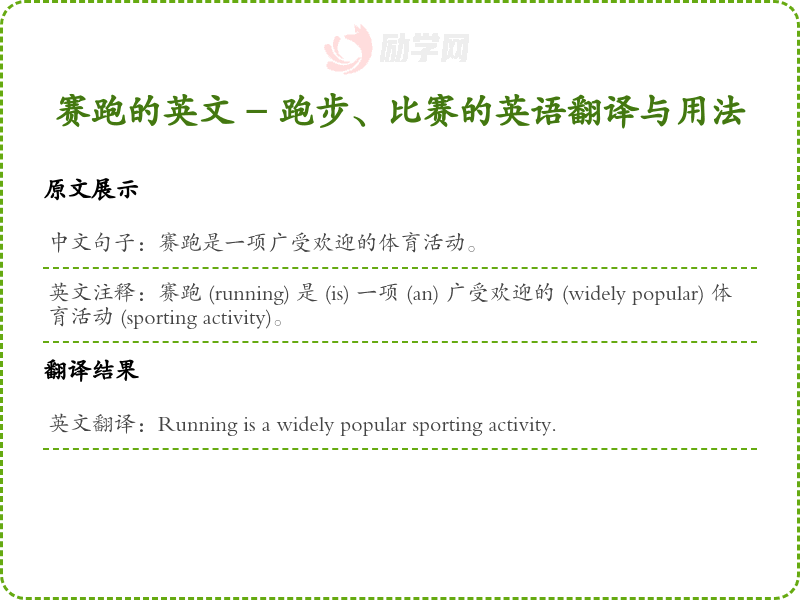 英文注释:赛跑 (running) 是 (is) 一项 (an) 广受欢迎的 (widely popular) 体育活动 (sporting activity)。