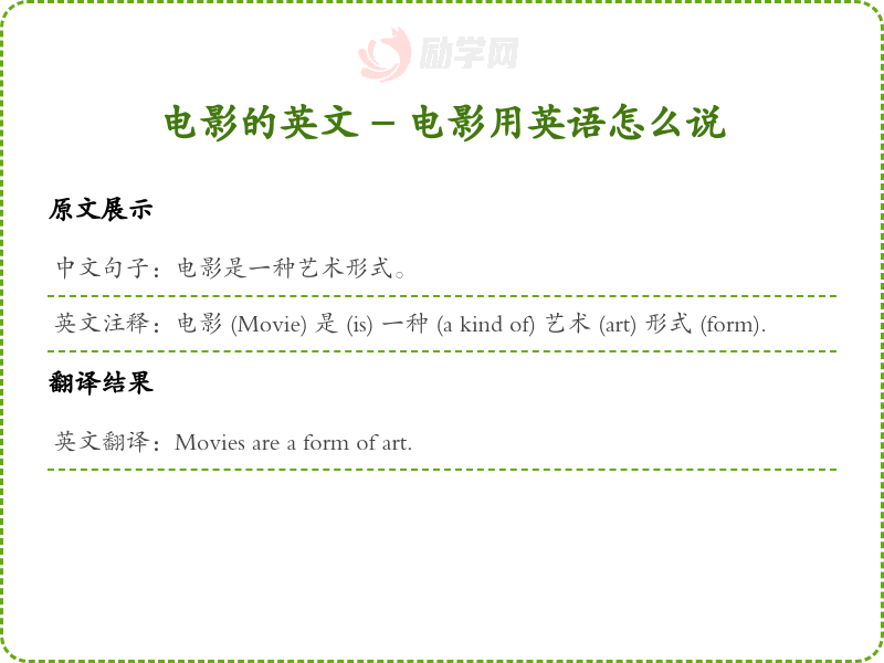 英文注释:电影 (Movie) 是 (is) 一种 (a kind of) 艺术 (art) 形式 (form).
