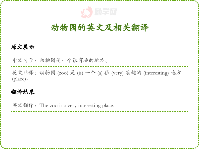 英文注释:动物园 (zoo) 是 (is) 一个 (a) 很 (very) 有趣的 (interesting) 地方 (place)。