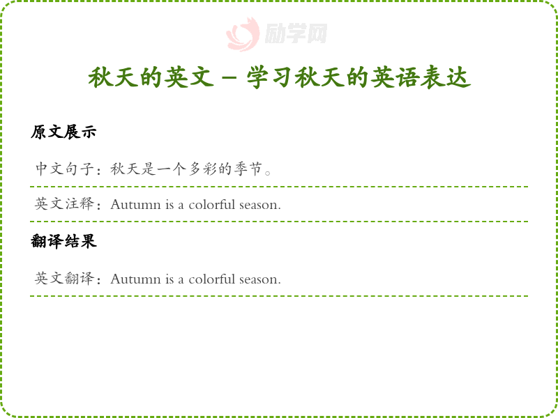 翻译思路:在翻译过程中,首先要理解原句的意思,然后将其分解成关键词进行逐步翻译。这里的‘秋天’可以直接翻译为‘Autumn’,而‘多彩的季节’则是对‘colorful season’的描述,整体句子结构保持一致,使其通顺流畅。