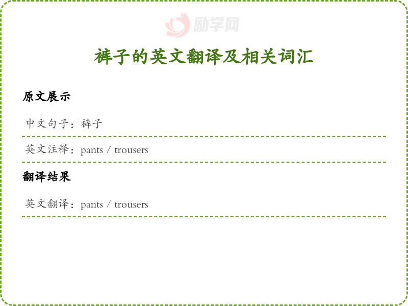 翻译思路:在翻译过程中,'裤子'的英文翻译主要为'pants'或'trousers',具体选择依赖于地区的语言习惯。美国英语中常用'pants',而在英国英语中则更常用'trousers'。